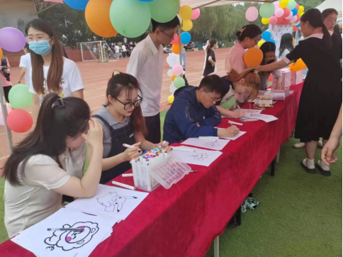 活动现场设置心语区、趣味竞赛区和特色活动展区三大活动区域。绘制“自画像”和交换“祝福”等心语区活动供学生进行沉浸式心理体验;“车轮滚滚”和“花样赛跑”等趣味竞赛区氛围紧张而激烈、加油声此起彼伏,同学们在团队游戏中充分合作,感受团结就是力量。