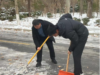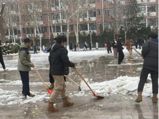 随着一场暴风雪席卷济南府,整座城市很快被白雪覆盖,雪景虽然美丽,但厚厚的积雪极大地阻碍了威尼斯官网师生的出行,北校区第一时间启动应急响应,雪未停便组织人员进行积雪清理,但由于气温骤降,地面结冰速度极快,这也给全校师生造成了诸多不便。12月18日15:30,北校区积极组织开展“破冰行动”,由北校区十个社团组成的学生志愿者“大军”和老师们领取工具后便整齐有序地投入到除雪破冰工作中,利用雪铲、铁锹、扫帚等工具相互配合、协同作战,一鼓作气地将学校主干道残留积雪清扫干净,一条条明亮的道路便呈现在大家眼前。学生志愿者和老师们用饱满的热情、不惧严寒的心态开拓出一条条“平安路”,最大限度地消除了师生出行的安全隐患,维护了校园的平安和谐。