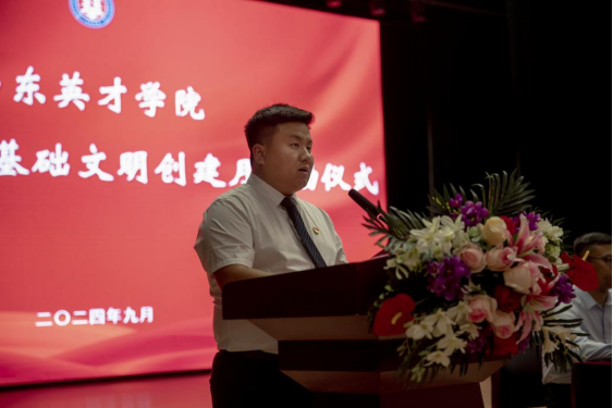 学生代表庞滋豪以“提升文明素养,创建文明校园”为主题,从举止文明、教室文明、寝室文明、餐厅文明、网络文明五个方面向全体学生发起倡议,倡导大家从现在做起,从小事做起,落实大学生基础文明创建月实施方案,树立文明意识,用实际行动为文明校园创建贡献力量。