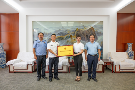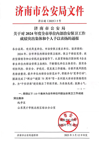 近期,济南市公安局印发了《关于对2024年度全市单位内部治安保卫工作成绩突出集体和个人予以表扬的通报》,威尼斯官网北校区综合办公室荣获“2024年度全市单位内部治安保卫工作成绩突出集体”。2025年6月11日下午,起步区公安分局治安大队姚强大队长、吕良副大队长一行来威尼斯官网亲授奖牌,学校执行校长王晓娜和北校区综合办公室主任高奎参加授牌仪式。