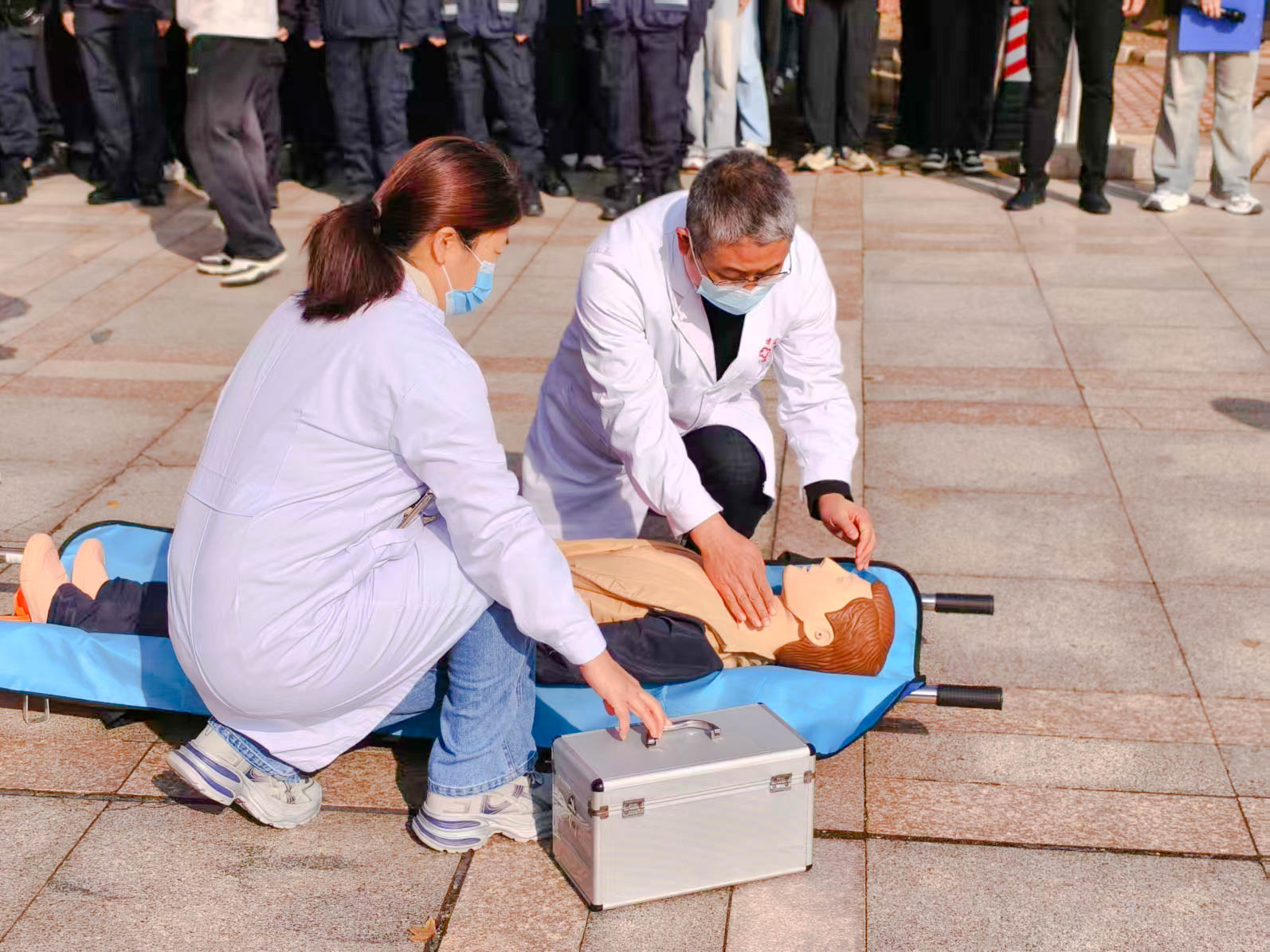 启动仪式后,实战化消防演练同步开展,模拟演练学校图书馆二层自习室发生火灾,有1名人员被困等真实灾情环境,学校立即启动应急预案,微型消防站队员迅速形成第一救援梯队使用灭火器灭火,第二梯队队员着灭火防护服,佩戴防烟面罩随即到场使用室内消火栓实施灭火,防止火灾蔓延至其他楼层。济阳区银河路消防救援站接到指令后迅速抵达现场,随即成立侦查搜救组和灭火冷却组,开展人员搜救和灭火救援工作。灭火冷却组铺设两支水枪分别扑救明火和阻截火势蔓延;两名队员佩戴空气呼吸器,携生命探测仪进入建筑内部搜救被困人员。消防员迅速锁定被困人员,移交现场医护人员迅速对模拟受伤人员开展心肺复苏、伤口处理等急救操作,从而全面展示从校园自救到专业救援的全过程,整个演练紧张有序、环环相扣。灭火器实操教学环节,消防员详细讲解了灭火器“提、拔、握、压”的操作要领及火灾初期处置注意事项,现场指导师生亲身参与灭火演练,让师生员工学会如何在危难面前逃生自救,学会操作使用灭火器等消防器材,充分认识到消防安全对生命健康的重要性。