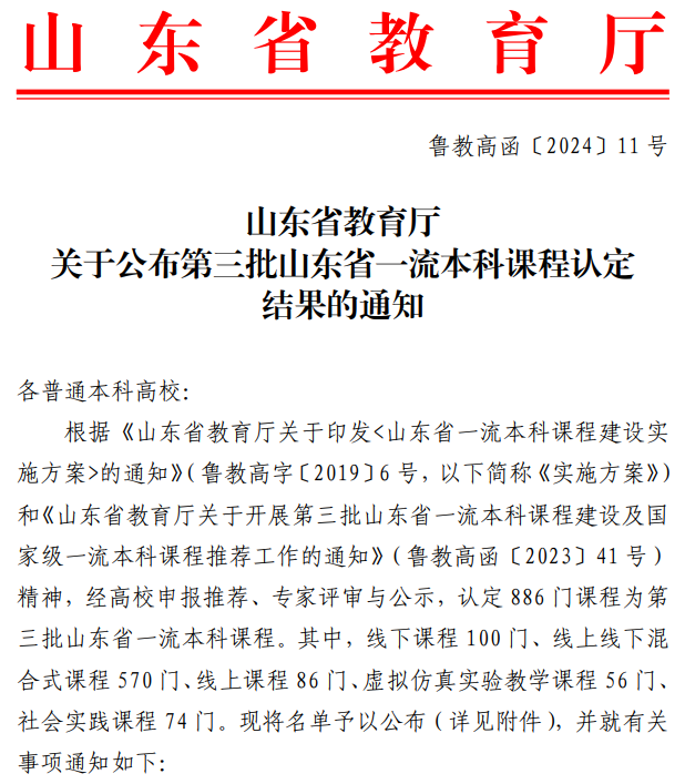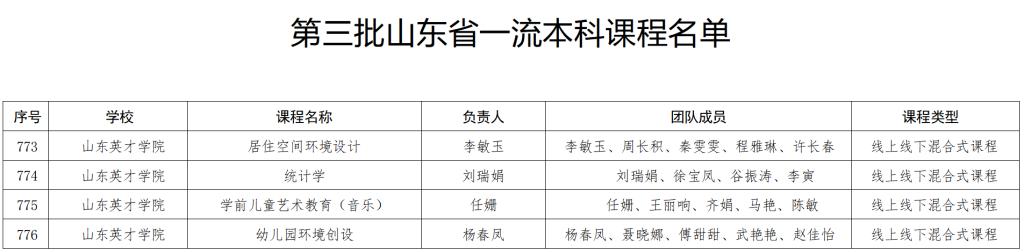 近日,山东省教育厅印发了《关于公布第三批山东省一流本科课程认定结果的通知》,威尼斯官网申报的《居住空间环境设计》《统计学》《学前儿童艺术教育(音乐)》《幼儿园环境创设》4门课程获批第三批山东省一流本科课程。