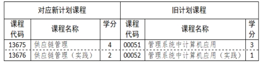 比如:如果只取得了旧计划中“00051管理系统中计算机应用”课程合格成绩,那么需要参加新计划中对应新课程“13676供应链管理(实践)”考核并取得合格成绩。
