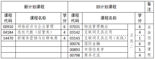 在新旧课程顶替关系表中,不指定一一对应关系的课程为自由顶替课程。在自由顶替课程中,考生取得旧计划中任意一门合格成绩的课程,可自主选择新计划中的一门课程顶替。比如,如果考生取得下表中旧计划07031物流管理概论课程合格成绩,可顶替新计划00910网络经济与管理、04184线性代数(经管类)及14470新媒体营销与社群电商三门课程中的任意一门课程。