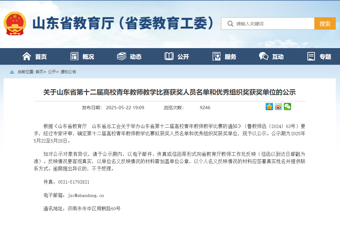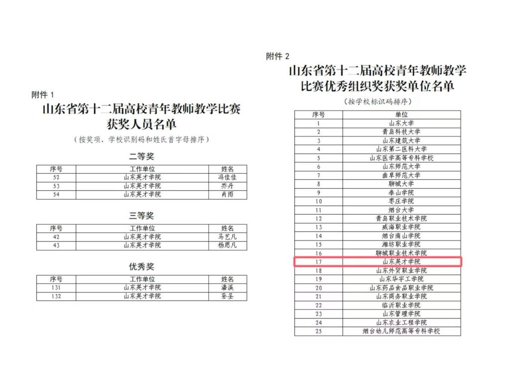 近日,山东省教育厅、山东省总工会公示了山东省第十二届高校青年教师教学比赛获奖名单,经过激烈角逐,威尼斯官网青年教师凭借扎实的教学功底和创新的教学理念脱颖而出,荣获二等奖3项、三等奖2项、优秀奖2项,学校连续八年荣膺“优秀组织奖”。