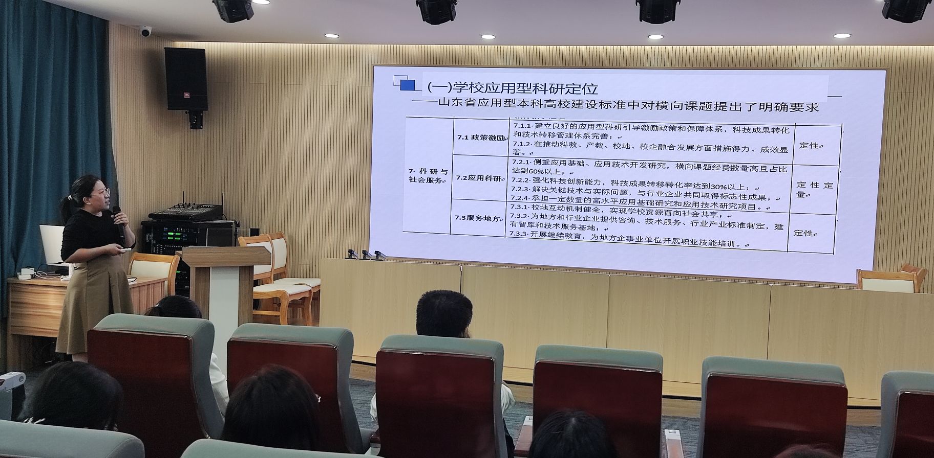 朱美副处长通过学校应用型科研定位、学校对教师的科研要求、横向课题的主要途径等方面重点解读了学校的横向项目政策,强调了承接横向课题的必要性和可行性,鼓励教师“转变思路,走出去最重要”。