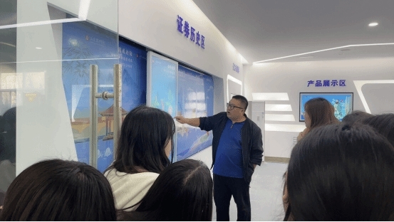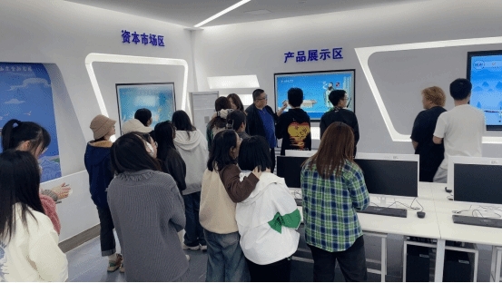 随后,谭老师带领金融专业的同学重点参观了位于一楼的智慧金融实验室,智慧金融实验室是集校内教学、学生参赛、职业资格培训、产教融合等四训一体的教学中心。实验室设有历史回顾区、证券知识区、风险警示区、专家讲堂区、体感游戏区、等多个展示区域,以“互联网+科技+金融+教育”为建设理念,集科技、教育、金融于一体,同学们参观并体验了各功能区域。