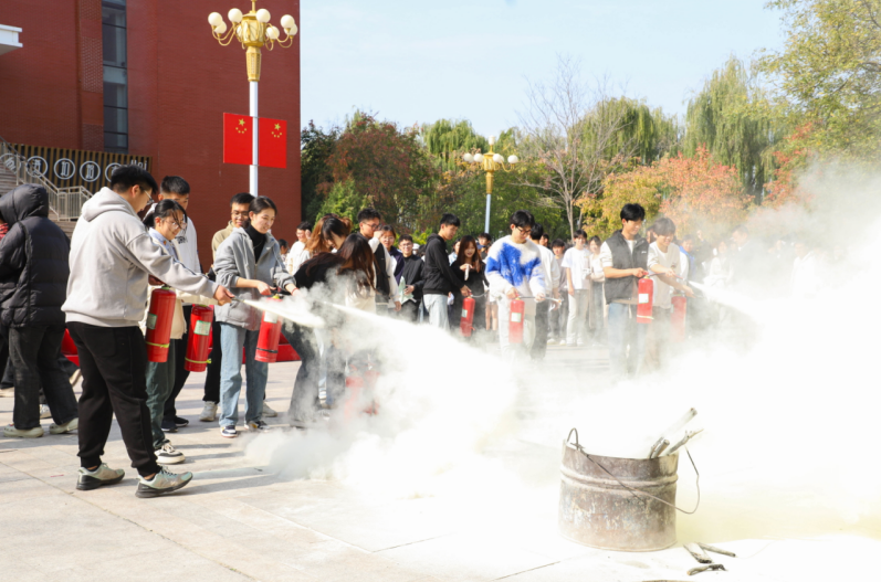 集合完毕后,在安全管理处韩长江老师的讲解和指导下,同学们了解了灭火器的正确使用方法及相关注意事项。现场师生积极配合,踊跃上前体验,手提灭火器灭火,在实践中将使用灭火器的“五字法”牢记于心。