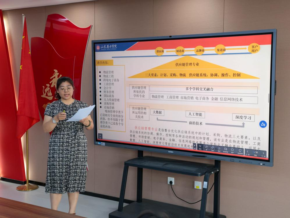 随后,拟新增供应链管理专业负责人刘杨老师详细汇报了供应链管理专业的申报基础与准备情况。刘杨老师从政策背景、人才需求、现有基础等多个维度进行了阐述。她指出,国家高度重视现代物流发展,出台了一系列政策文件,为供应链管理专业的建设提供了良好的政策环境。同时,随着济南新旧动能转换起步区的快速发展,智慧物流作为重要产业,对供应链管理人才的需求日益增长。商学院(国际学院)在管理学、经济学领域拥有深厚的学术积淀,物流管理专业作为山东省一流本科专业建设点,为新专业的申报提供了有力支撑。此外,学院还拥有一支经验丰富、结构合理的师资队伍,以及先进的电商物流虚拟仿真实验室和新商科综合实验教学中心,与多家企业建立了紧密的校企合作,为学生提供了广阔的实习、就业平台。