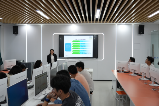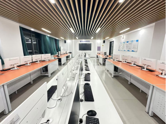 这间是智慧财税实验室,建筑面积100平方米,配备学生端电脑50台,主要服务于财务管理、会计和审计学等专业。