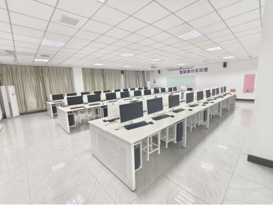 该实验室占地约120平方米,可满足60名学生同时进行实训实验课程,目前有学生计算机60台,服务器、交换机及其他相关附属多媒体教学设备,主要为审计专业提供实训教学服务。
