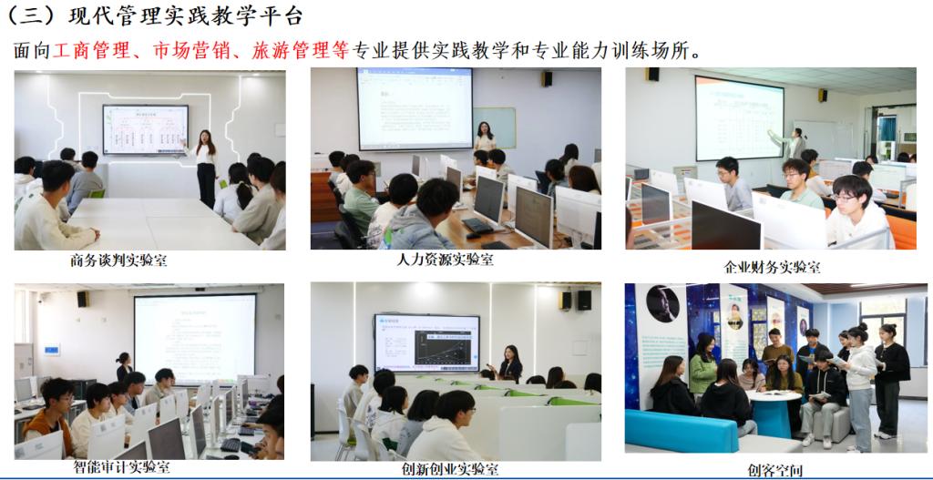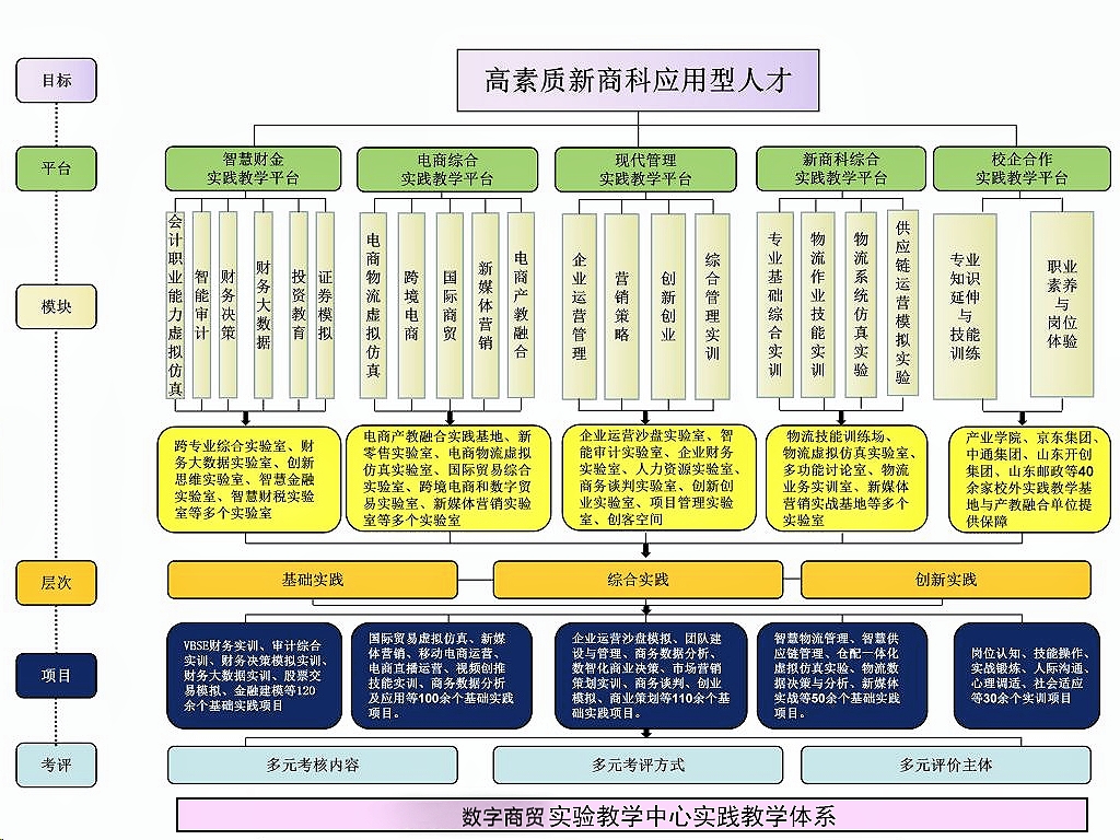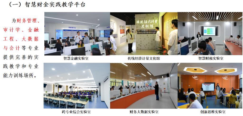 同时构建五个实践教学平台, 培养高素质新商科应用型人才。智慧财金实践教学平台,为财务管理、审计学、金融工程专业提供实验教学场所。