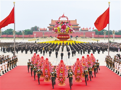 庄严的天安门广场上,鲜艳的五星红旗高高飘扬。广场中央,“祝福祖国”巨型花篮表达着对国家繁荣昌盛的美好祝愿,花篮上“欢度国庆”的字样分外醒目。人民英雄纪念碑巍然耸立,北侧两组花坛上镶嵌着白菊、康乃馨等鲜花组成的18个花环,寄托着全体中华儿女对英烈的深情追思。 本报北京9月30日电 烈士纪念日向人民英雄敬献花篮仪式30日上午在北京天安门广场隆重举行。党和国家领导人习近平、李克强、栗战书、汪洋、王沪宁、赵乐际、韩正、王岐山等,同各界代表一起出席仪式。