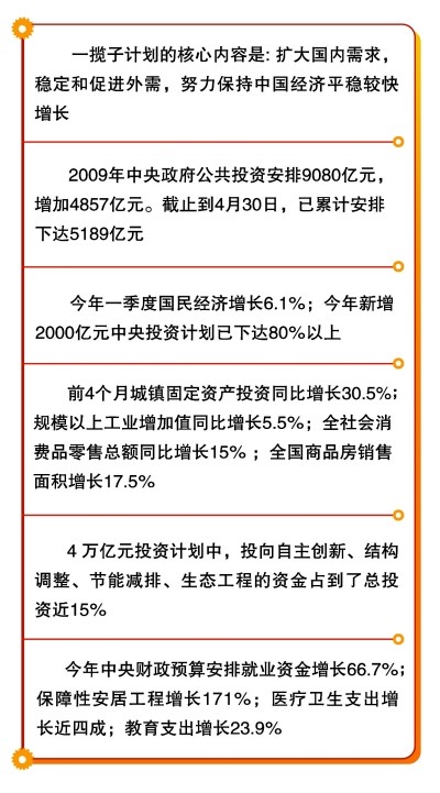 这是扩大内需和稳定外需相结合的一揽子计划,是调整振兴产业和加强科技支撑的一揽子计划,是改革创新和实现新发展的一揽子计划,是改善民生和加强社会保障的一揽子计划。半年来的实践表明,这一揽子计划已初见成效,不但使经济运行出现积极变化,而且进一步提高了经济发展的质量。