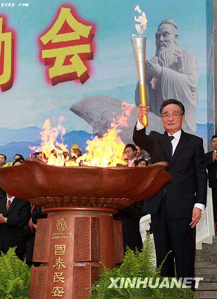 东门外广场隆重举行。这是吴邦国在“国泰民安”圣火坛前,点燃手中的主火炬,