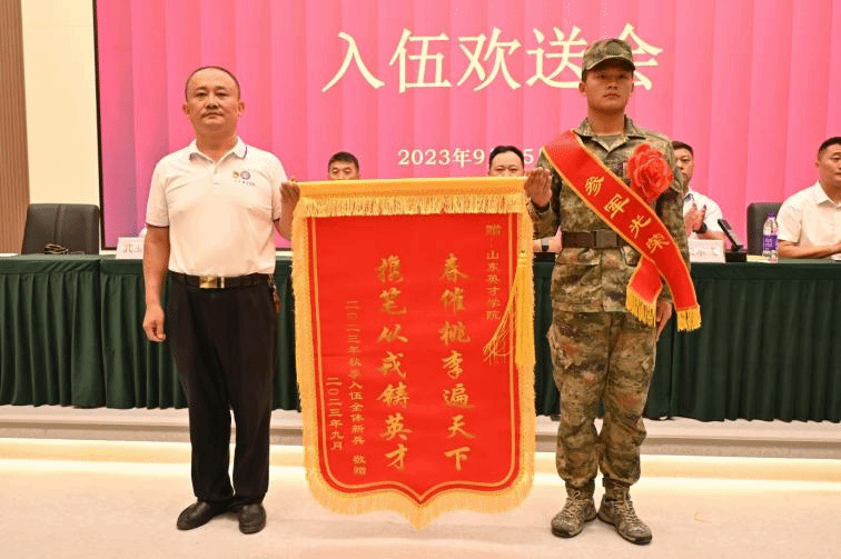 欢送会在嘹亮的国歌声中拉开序幕,新兵们胸戴红花、身披绥带,军姿挺拔,带着对军营的向往和憧憬,整齐队列。与会领导为入伍新兵颁发入伍通知书及纪念品,入伍新兵代表向学校赠送锦旗。