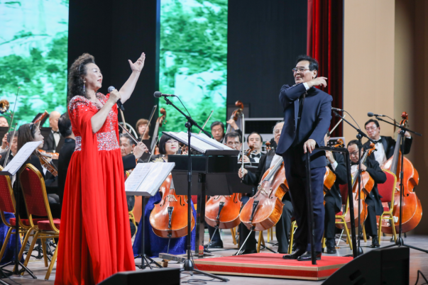 音乐会在大气磅礴、激情澎湃的管弦乐《欢庆》中正式开始,交响乐《红旗颂》,将听众带回开国大典升旗仪式那令人激动的时刻,朗诵与男中音独唱《满江红》、交响乐《沂蒙山》序曲、女声独唱《再唱沂蒙山》、交响乐《康康舞曲》、琵琶独奏《送你一枝玫瑰花》、管弦乐《我的祖国》、男声四重唱《志愿军战歌》、交响乐《法兰多尔》等旋律在英才音乐厅逐一回响……师生被美妙的音乐折服,一次次以热烈的掌声表达对乐团精湛表演的赞叹。当熟悉的管弦乐《我和我的祖国》旋律响起,在场师生纷纷情不自禁与乐团合唱,在音乐里体悟家国情怀。最后,在一曲管弦乐《花好月圆》中,听众们感受到了艺术的无限可能,仿佛看到了新时代的美好前景,音乐会在此刻画上圆满的句号。