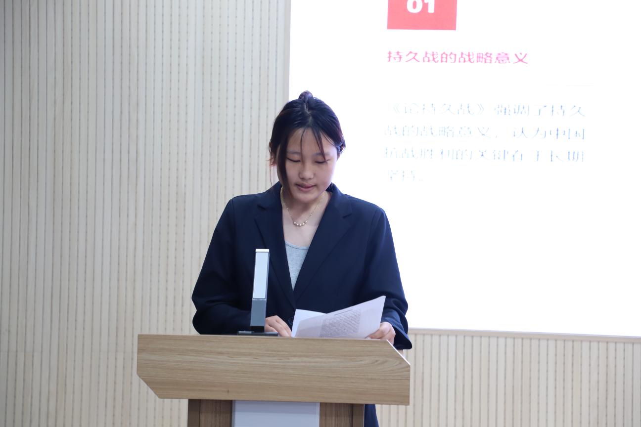 本次读书交流会的活动主题是“《论持久战》中历史背景与影响”。宣讲员们让同学们学习到了20世纪30年代,《论持久战》是毛泽东同志于1938年发表的经典著作,科学预判了抗日战争的全局进程,提出了“持久战”的战略思想,为全民族抗战指明了方向。毛泽东同志通过分析敌我力量对比、战争性质与人民力量,展现了战略思维的全局性与预见性,至今仍对应对复杂挑战具有重要启示。”