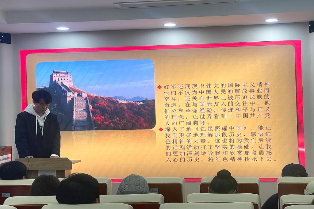 为了让同学们更深入地了解中国革命历史,感受革命先辈的伟大精神,坚定文化自信,培养历史使命感。2025年3月14日,青马宣讲团联合其他学生组织于图书馆孔孟讲堂开展分享《红星照耀中国》一书中中国共产党的早期斗争相关内容,让南校区校团委和各二级学院团学组织成员感受那红色的光芒,汲取前进的动力,向着美好的未来奋勇前行。