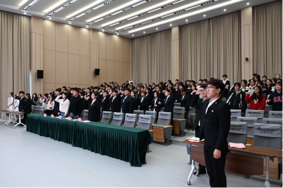 学生会主席张明烨带领学生会全体成员庄严宣誓,他们高举右手,誓言铿锵,展现出了为同学服务、为学校贡献的坚定决心。
