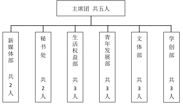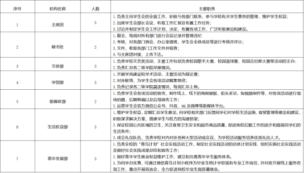 学生会下设秘书处、学创部、生活权益部、新媒体部、青年发展部、文体部6大部门。根据工作需要可由学生会主席团对本机构适当调整。
