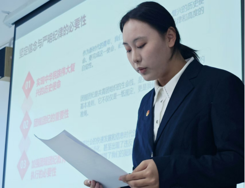 然后,青马宣讲团文声莹同学做“加强团规团纪教育,塑造时代青年才俊”主题分享。她指出团规团纪的重要性,带领大家学习《中国共产主义青年团纪律处分条例(试行)》节选条例。她呼吁大家共同营造一个风清气正的团组织环境。