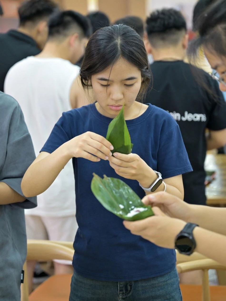翠绿的粽叶在手中折叠,莹白的糯米中香甜的红枣若隐若现,五彩棉线细致捆扎,在老师们的细心指导下,同学们逐渐熟练的掌握了包粽子的技巧,传承千年的技艺在指尖流淌,清香弥漫间是对于传统技艺的体验,粽叶翻飞中是对安康与团圆最质朴的祈愿。