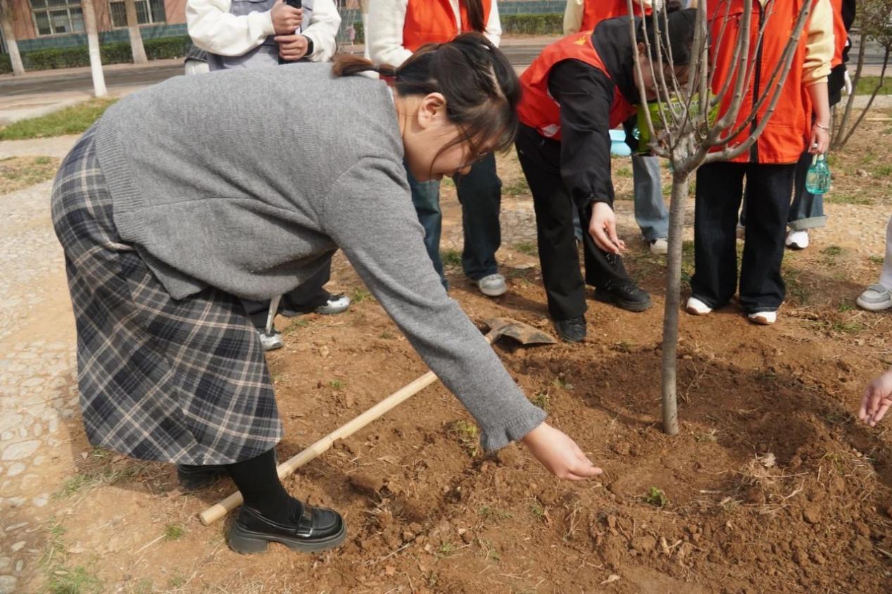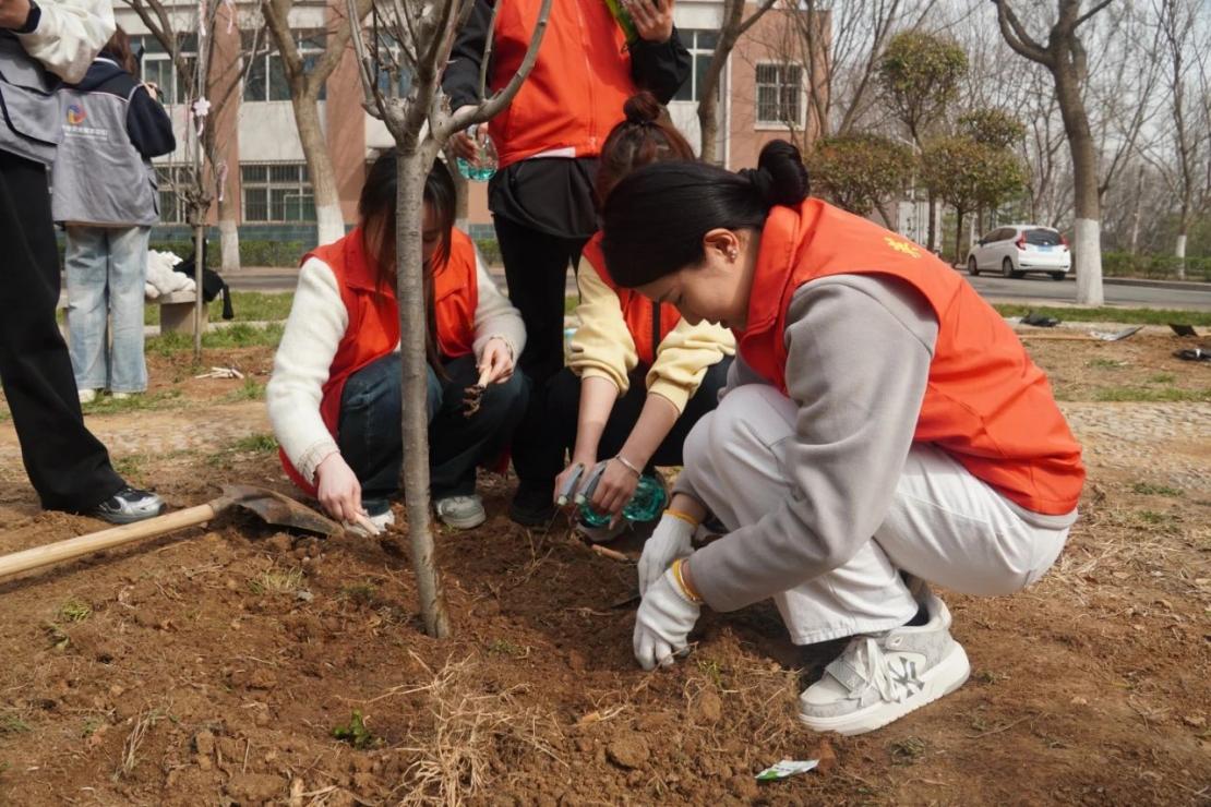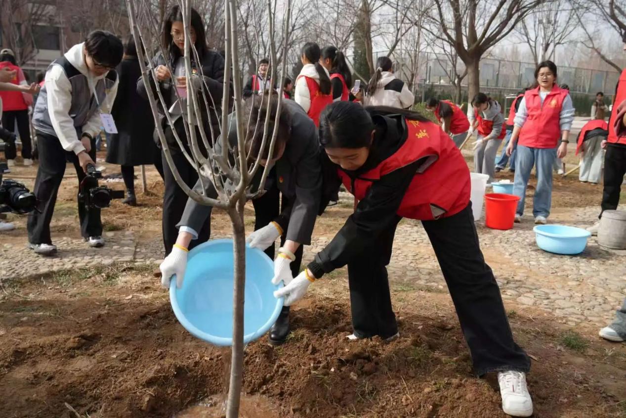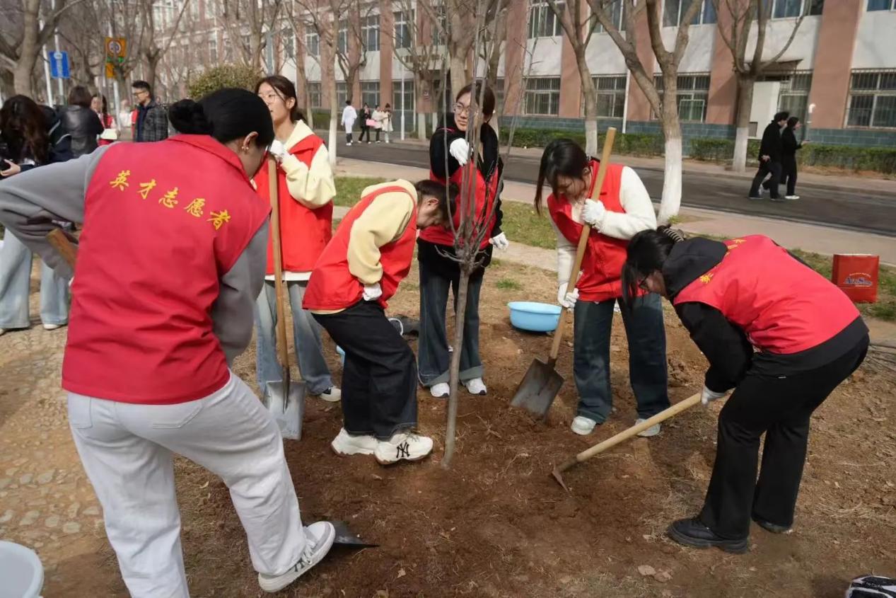 活动现场,师生们热情高涨,干劲十足。大家以小组为单位,分工协作,挥锹铲土、扶苗坑、浇水灌溉,每一个步骤都认真细致,每一道工序都一丝不苟。在大家的共同努力下,一棵棵新栽种的树苗昂然挺立,在春风中展现出勃勃生机。