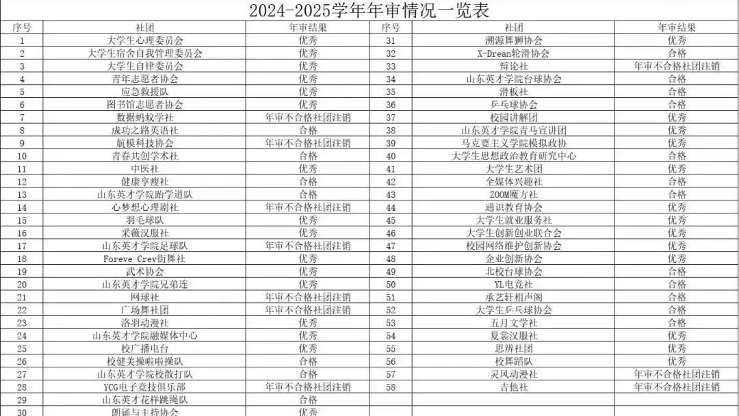 通过对58个注册学生社团提交材料的认真核查,2024-2025 学年学生社团年审工作顺利结束,现将学生社团年审结果公布如下: