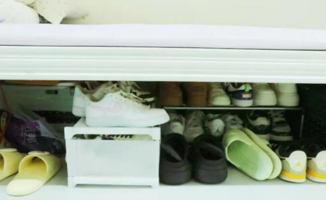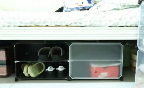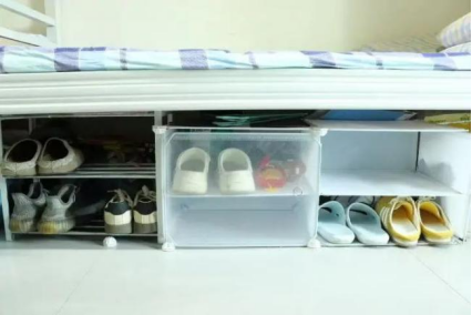 功能分区利用利用多层鞋架进行鞋子收纳。将不同类型、季节的鞋子分类摆放,能充分利用垂直空间,保持宿舍地面整洁,避免鞋子乱放造成的杂乱无章,而且方便查找和拿取鞋子。