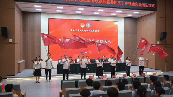 仪式的第二部分为暑期“三下乡”社会实践出征仪式。校团委书记张瑞君宣读《关于组织开展2025年暑期“三下乡”社会实践活动的通知》。党委副书记孙玉香为2025年暑期“三下乡”社会实践团队代表授旗,老师们挥舞着旗帜,“让青春为实现中国式现代化挺膺担当”的口号响彻整个会场。旗帜是引领,也是承诺,激励着英才青年投身基层,书写新时代的奋斗篇章。暑期“三下乡”社会实践重点团队代表黄钰姣分享了团队的实践规划,表示会充分发挥专业优势,在社会实践中深入基层、服务群众,将青春足迹印刻在祖国的大地上。
