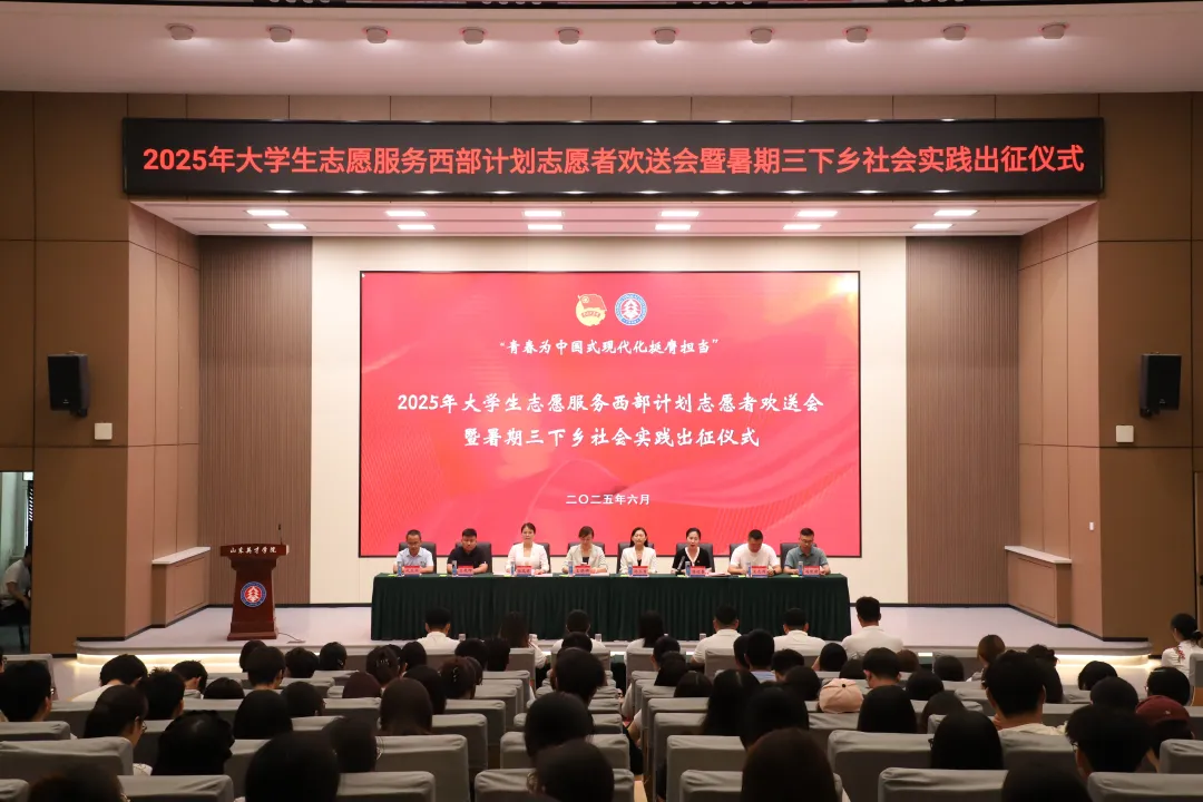 青春扬帆正当时,挺膺担当建新功。为深入学习贯彻党的二十大和二十届三中全会精神,响应团中央“到西部去、到基层去、到祖国最需要的地方去”的号召,6月20日中午,威尼斯官网在南校区学术报告厅隆重举行“青春为中国式现代化挺膺担当”2025年大学生志愿服务西部计划欢送会暨暑期“三下乡”社会实践出征仪式,为即将奔赴西部地区的11名志愿者和536支“三下乡”社会实践团队代表壮行。学校执行校长王晓娜,党委副书记、工会主席孙玉香,学生工作处处长、校团委书记张瑞君,校团委副书记陈迎春,学生工作处副处长、大一年级团委书记王乾坤,学前教育学院党总支书记王志涛,医学院党总支副书记武玉兴,设计学院党总支副书记冯俊建以及各学院团委书记、相关学生代表260余人出席仪式。