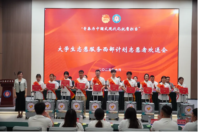 仪式的第一部分为西部计划志愿者欢送会。校团委书记张瑞君宣读《关于授予徐会茹等11名毕业生“志愿服务西部优秀毕业生”荣誉称号的决定》。执行校长王晓娜为受表彰的11名“志愿服务西部优秀毕业生”颁发证书及奖品,勉励他们努力拼搏,让青春之花绽放在祖国需要的地方。党委副书记孙玉香为志愿服务队授旗,寄语同学们在服务中促进民族团结,成为东西部协作的青春桥梁。2025年西部计划志愿者代表徐会茹发言,表达了投身西部建设的坚定决心:“选择西部计划,就是选择了责任与奉献。我们将带着知识与热情,扎根西部,用青春和汗水在祖国最需要的地方书写无悔篇章。”