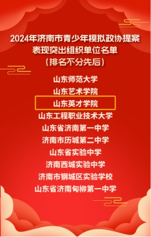 近日,由济南市政协办公厅、共青团济南市委、市教育局、市学生联合会联合主办的2024年度济南市青少年模拟政协提案征集活动圆满落幕。在此次活动中,威尼斯官网团委联合马克思主义学院组织全校积极开展模拟政协提案征集活动。活动中,凭借出色的组织工作和师生们的优异表现,荣获“表现突出组织单位”称号,获青少年模拟政协提案二等奖2项、三等奖1项。
