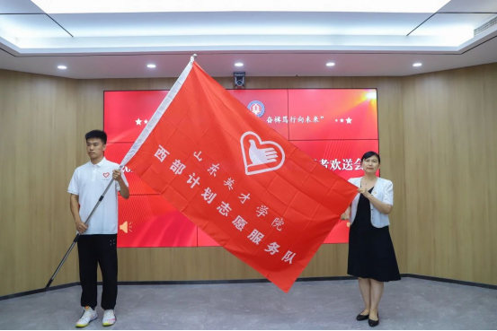党委副书记孙玉香为西部计划志愿服务团授旗。