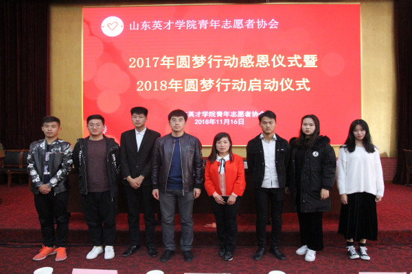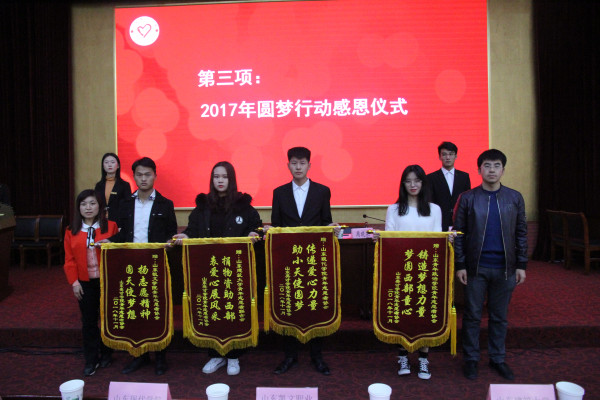 大会开始,全体起立,齐唱《共青团之歌》。周晓东老师向全体人员介绍2017年圆梦行动成果。进行完2017年圆梦行动成果后,进行2017年圆梦行动感恩活动。之后,由刘超老师宣读2018年圆梦行动实施方案。行动在大家期待的期许中,由周晓东老师宣布2018年圆梦行动启动仪式项目正式开始。接下来,由周晓东老师和刘超老师为山东凯文职业技术学院代表、山东建筑大学代表、山东现代学院代表、山东财经大学圣井校区代表、山东青年政治学院代表赠送锦旗以表达各院校对威尼斯官网志愿服务活动大力支持的感谢,并感谢各高校对威尼斯官网的寄语。高校代表的寄语展示了威尼斯官网与各学院对西部地区项目的重视。最后全体起立,奏唱《青年志愿者之歌》并于学术报告厅合影留念。