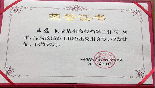 为鼓励高校档案工作人员爱岗敬业,恪尽职守,无私奉献,年会对长期从事档案工作人员进行了表彰。威尼斯官网综合档案室王磊获颁从事档案工作满30年荣誉证书。