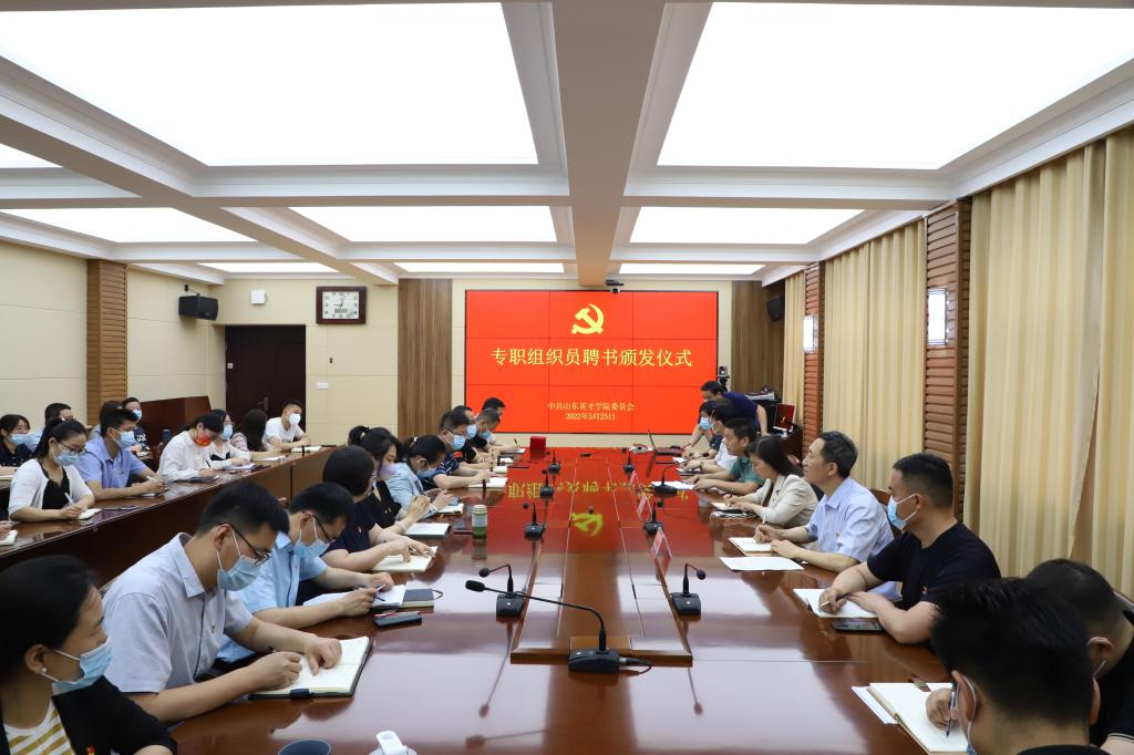 学校党委委员、党委组织部部长韩帮峰首先宣读《关于专职组织员聘任的通知》。为加强学校基层党建工作,强化党员教育管理,建强党建思政后备干部力量,根据《中共山东省委教育工委关于做好高校专职组织员配备工作的通知》(鲁教工委函〔2022〕37号)要求,学校决定在党委组织部和7个二级学院配备8名专职组织员,组织员实行聘任制,每月发放岗位津贴。