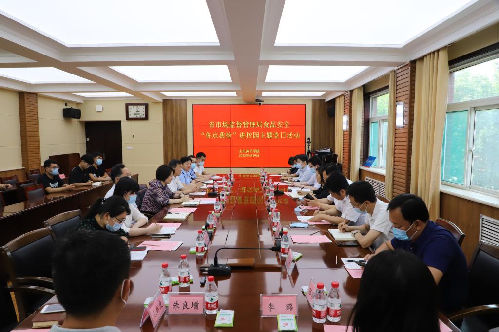 为进一步加强食品安全保障力度,增强师生校园食品安全消费的获得感、安全感,践行“我为师生办实事”活动,6月9日下午,山东省市场监管局、济南市市场监管局、高新区市场监管部,省、市、区三级食品安全“你点我检”进校园活动在威尼斯官网举行。省市场监管局抽检特食处处长邹芳勤,市市场监管局党组成员、副局长李学忠等领导出席活动。学校校长刘珊珊、副校长梁庆文、纪委书记孙玉山及部分师生代表参加座谈。学校副校长梁庆文主持座谈会。