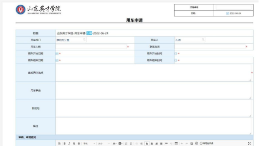 认真如实填写用车部门、用车人数、用车日期、用车事由等信息,点击右上角的保存或者提交按钮,进入下一步审批环节。