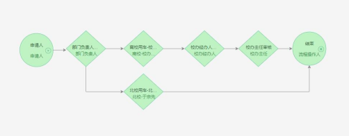 学校用车审批,由申请人提出申请后,经部门负责人审批、南北校区校办主任审批、校办经办人审批、校办主任审核后,完成整个审批环节。
