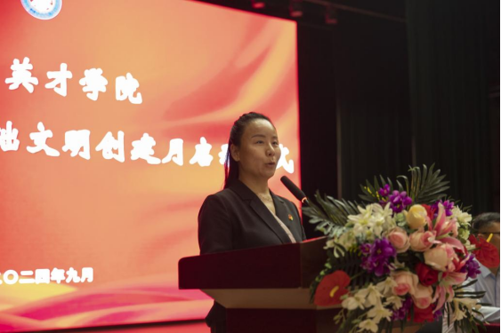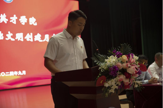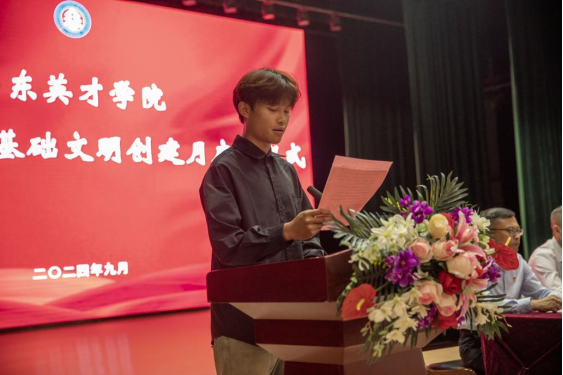 学生代表庞滋豪以“提升文明素养,创建文明校园”为主题,从举止文明、教室文明、寝室文明、餐厅文明、网络文明五个方面向全体学生发起倡议,倡导大家从现在做起,从小事做起,落实大学生基础文明创建月实施方案,树立文明意识,用实际行动为文明校园创建贡献力量。