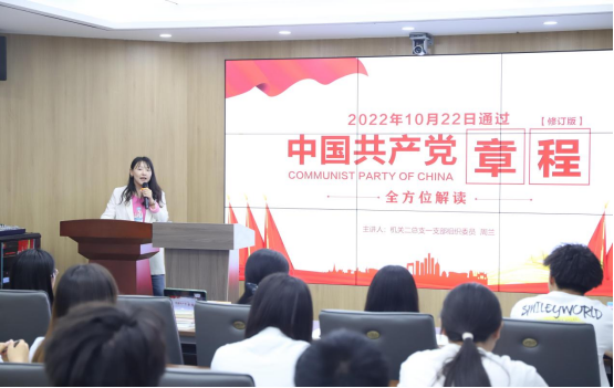 机关二总支一支部组织委员周兰以“全方位解读中国共产党章程”为题讲座。党章是党的根本大法,是党员行为准则。通过解读,学员们立足本职,努力学习工作,期待早日从思想和组织上融入党组织。