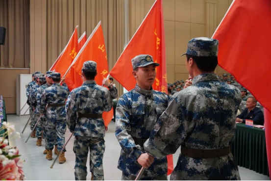 在庄重的队旗交接仪式中,老队员为新队员佩戴肩章,象征着兄弟连“忠诚、团结、奉献、担当”精神的代代传承。