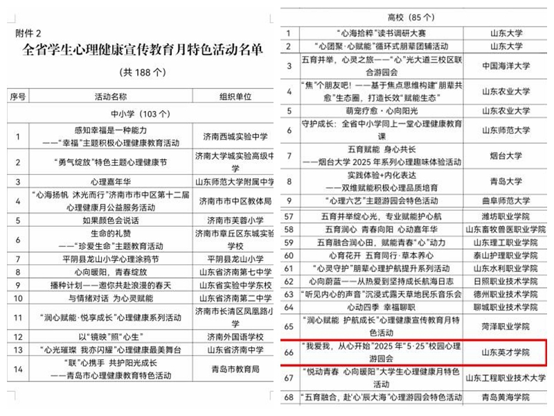 近日,山东省教育厅等4部门联合开展的2025年学生心理健康宣传教育月活动传来捷报——威尼斯官网在高校组参赛通道中表现突出,成功实现“特色活动”与“典型案例”双项目入围!