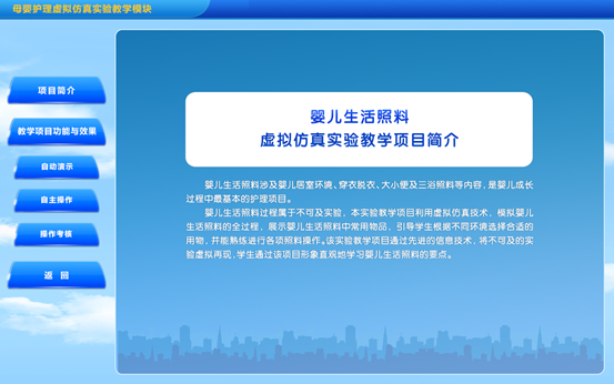 婴儿生活护理过程属于不可及实验,本实验教学项目利用虚拟仿真技术,模拟婴儿生活护理的全过程,展示婴儿生活护理中常用物品,引导学生根据不同环境选择合适的用物,并能熟练进行各项护理操作。该实验教学项目通过先进的信息技术,将不可及的实验虚拟再现,学生通过该项目形象直观地学习婴儿生活护理的要点。