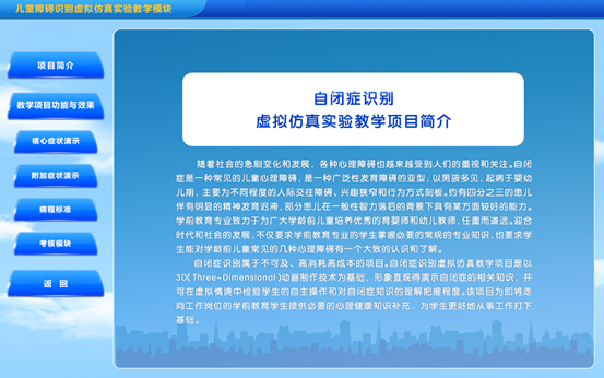 本项目主要包括自闭症核心症状、附加症状和病程标准演示及知识考核四个模块,从演示自闭症相关知识入手,通过仿真演示和人机互动达到掌握自闭症识别知识的目的。