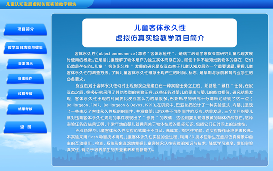 本实验项目主要包括婴儿客体永久性实验自主演示、自主操作、过程考核、结果考核四个模块,从观摩实验完整操作入手,通过互动操作方式实现婴儿客体永久性实验——这种不可及、高成本、综合性实验教学的目的。