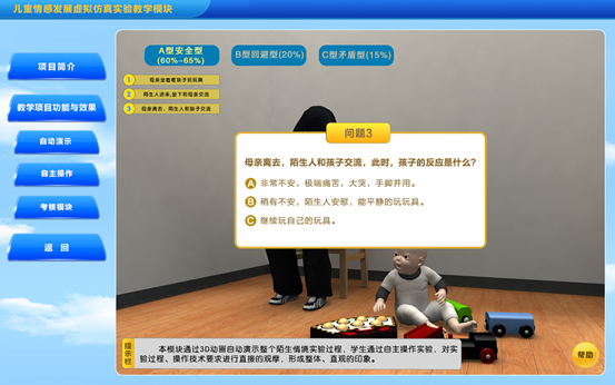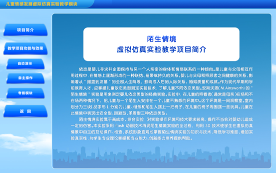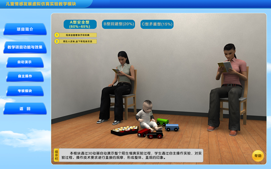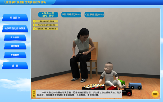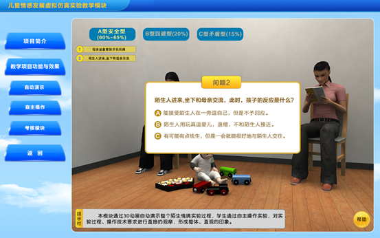 陌生情境实验属于高成本、综合实验,对实验操作环境和技术要求较高,操作不当会对婴幼儿造成一定的伤害。本实验采用flash动画技术再现陌生情境实验的全过程,利用3D技术使学生在虚拟仿真情景中自主的互动操作、检查,系统形象直观地掌握陌生情境实验的知识与技术,降低学习难度、增加实验真实性,为学生专业理论掌握和专业能力、创新能力培养提供帮助。