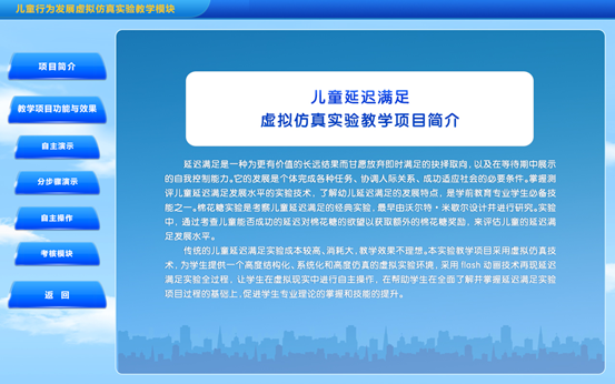 传统的儿童延迟满足实验成本较高、消耗大,教学效果不理想。本实验教学项目采用虚拟仿真技术,为学生提供一个高度结构化、系统化和高度仿真的虚拟实验环境,采用flash动画技术再现延迟满足实验全过程,让学生在虚拟现实中进行自主操作,在帮助学生在全面了解并掌握延迟满足实验项目过程的基础上,促进学生专业理论的掌握和技能的提升。